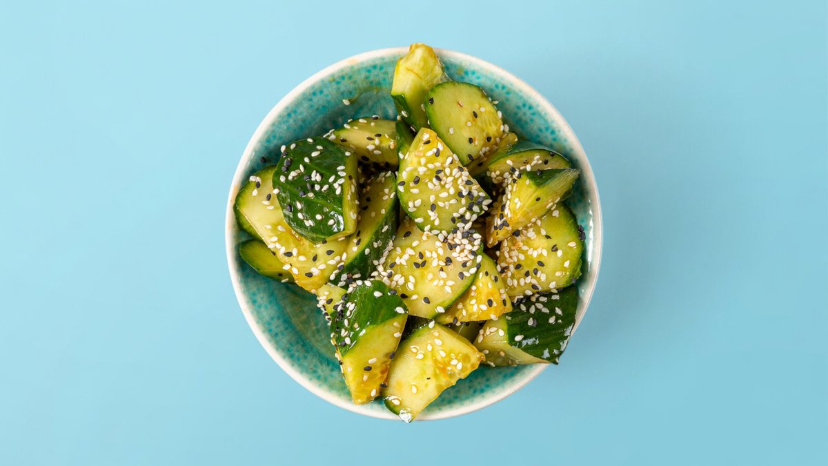 Frisch geschnittene Gurken, mariniert in Sojasoße, Chiliöl, Pfefferöl und Sesamöl mit schwarzem und weißem Sesam