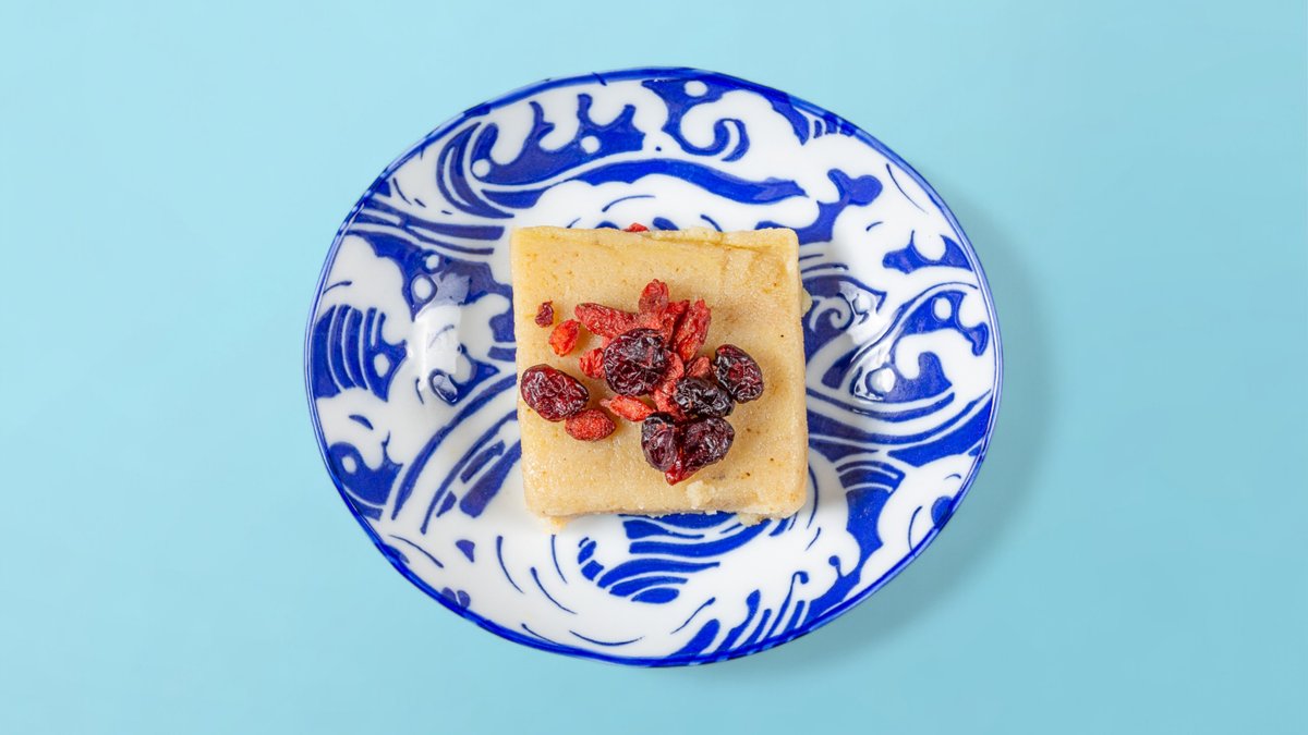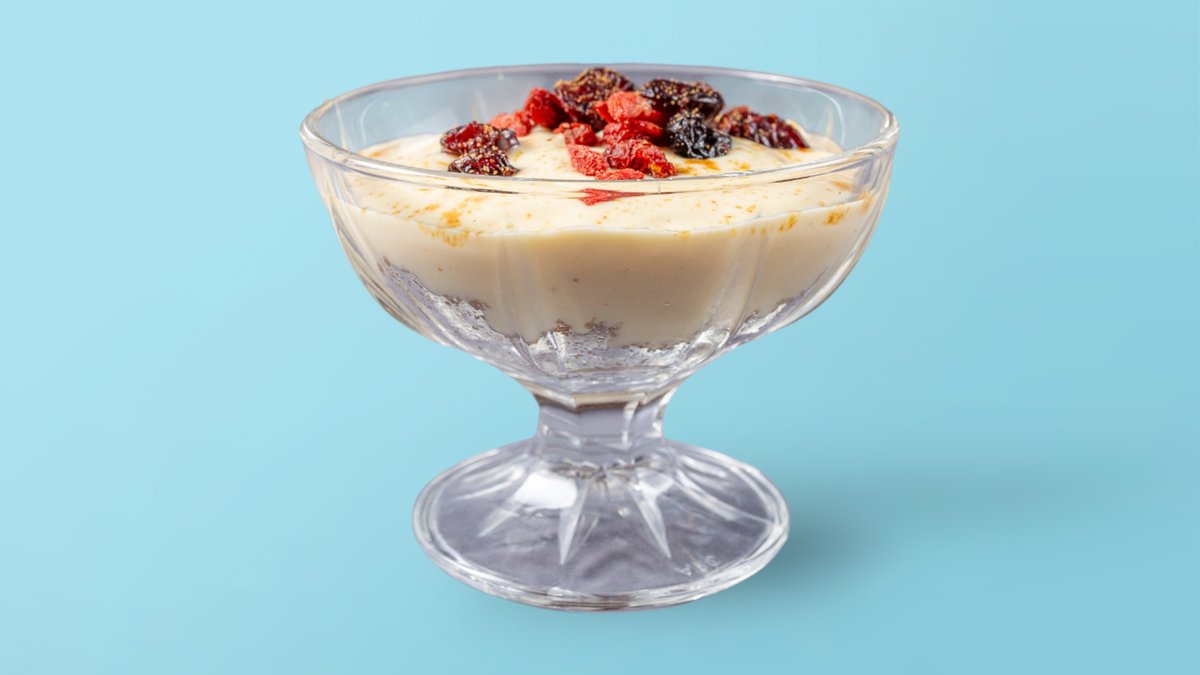 Gerstenkörner, geröstet und zu Mehl gemahlen, vermischt mit veganer Butter und braunem Zucker, serviert mit Joghurt und Trockenfrüchten