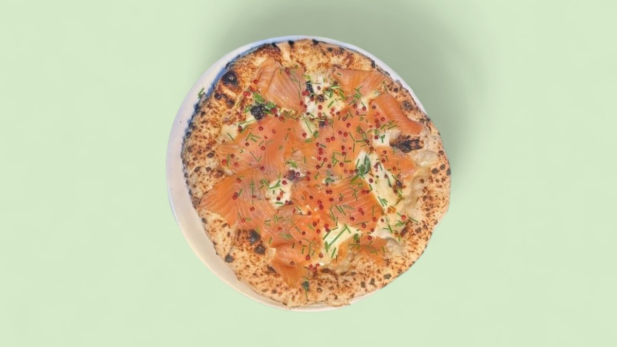 Parmesan Creme, Fior di Latte Mozzarella, Lauch Zwiebel, Lachs, Rosa Beeren & Olivenöl