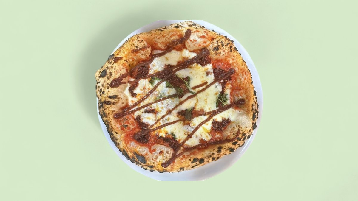 San Marzano Tomatensauce, Fior di Latte Mozzarella, Pfeffer, Provola, Polpette & Basilikum