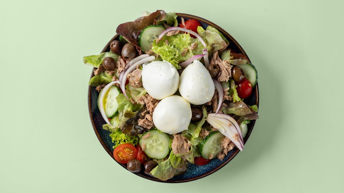 mit gemischtem Salat, Gurken, Kirschtomaten, Thunfisch, Oliven, Zwiebeln, Büffelmozzarella aus Italien und Apfeldressing