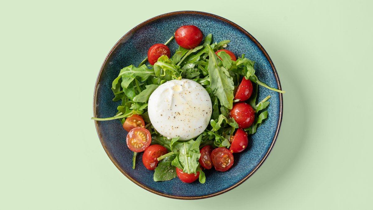 mit Burrata Mozzarella, Rucola, Kirschtomaten, Basilikum und Olivenöl