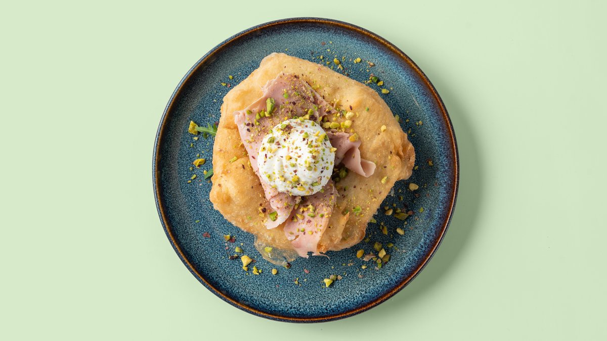 frittierter Pizzateig mit Mortadella aus Schweinefleisch, Pistazien, Basilikum und Ricotta
