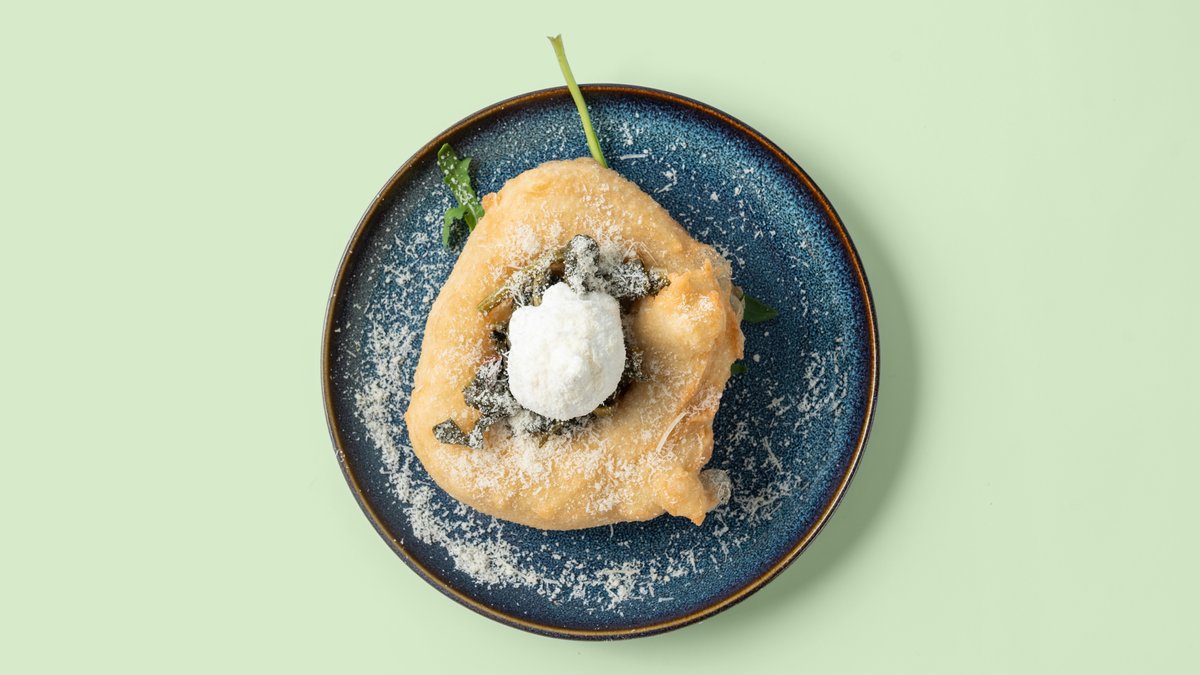 frittierter Pizzateig mit Friarielli, Parmesan, Basilikum und Ricotta