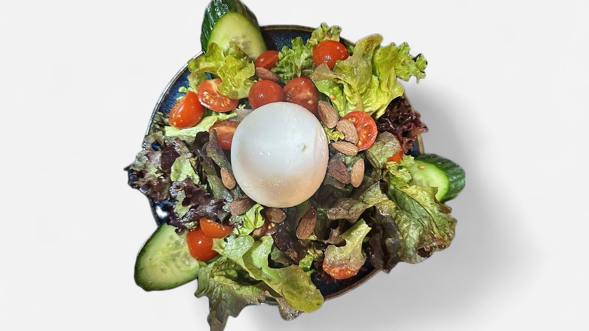 mit gemischtem Salat, Gurken, Kirschtomaten, Apfeldressing, Burrata und gesalzenen Mandeln