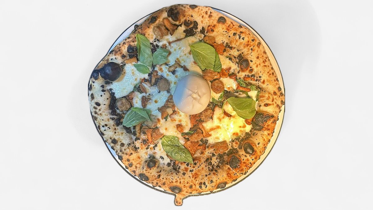 mit Trüffelcreme, Pfefferlingen, Salsiccia aus Schweinefleisch, Burrata, Basilikum und Olivenöl