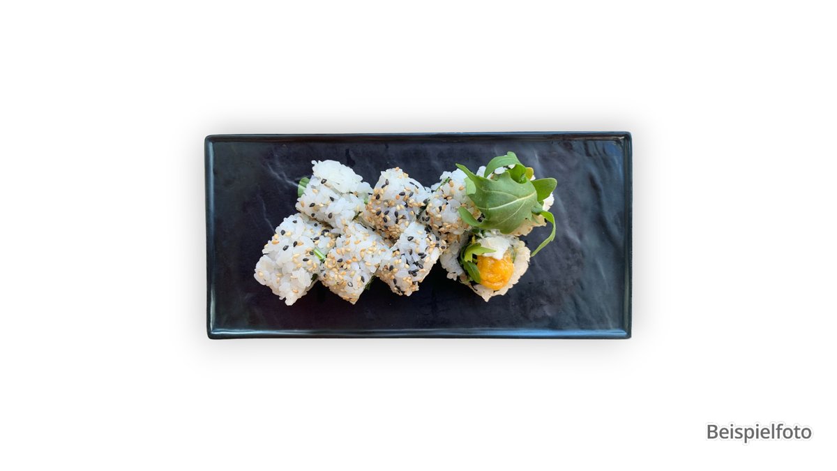 Avocado im Tempuramantel, Mango, Gurke, Philadelphia, Lachsmantel