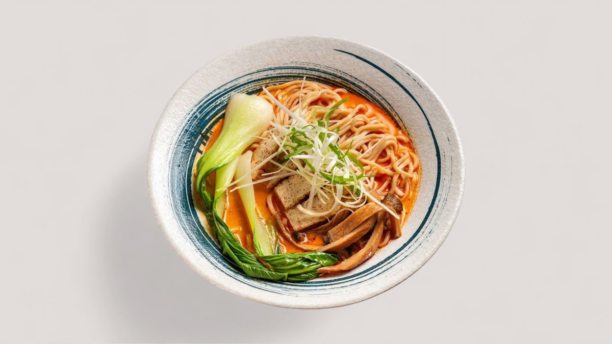 Leicht scharf Hausgemachte Nudeln in hausgemachter Rote Curry-Brühe mit Tofu, Kräuterseitling, Koriander, Pak Choi und Lauchzwiebeln