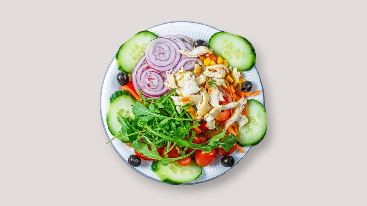 mit Gurken, Mais, Möhren, Oliven, Paprika, Rucola, gebratener Hähnchenbrust und Zwiebeln