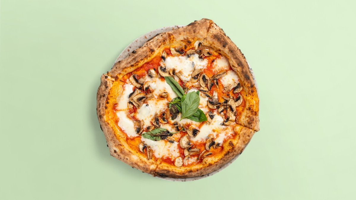 mit Fior di Latte, Parmesan, Basilikum, gekochtem Schinken vom Schwein, Champignons, schwarzen Oliven, Büffelmozzarella und Olivenöl