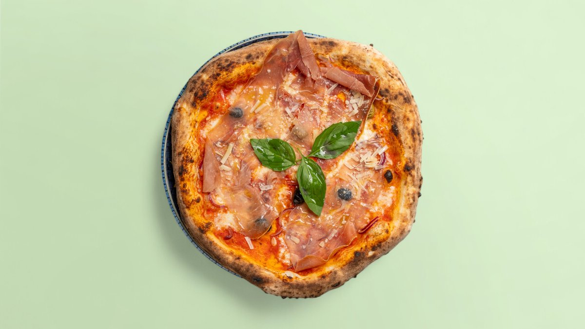 mit Fior di Latte, luftgetrocknetem Schinken vom Schwein, Parmesan, Zwiebeln, Basilikum, schwarzen Oliven und Olivenöl