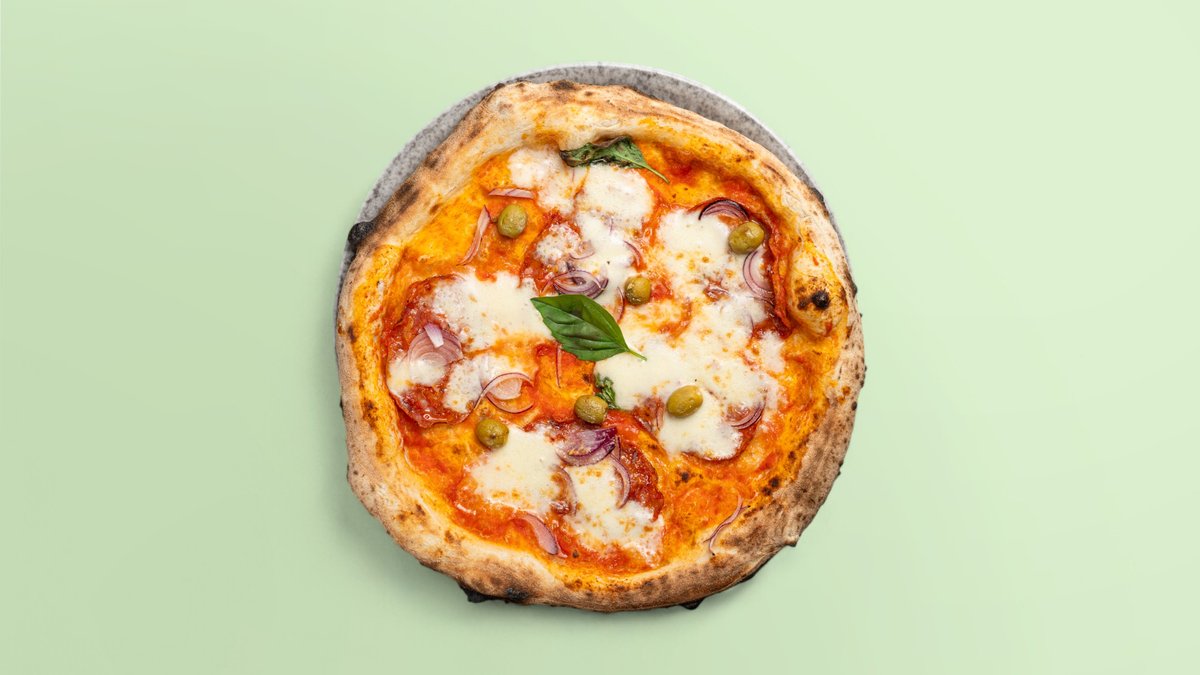 mit Fior di Latte, scharfer Salami vom Schwein, Parmesan, Zwiebeln, Basilikum, schwarzen Oliven und Olivenöl