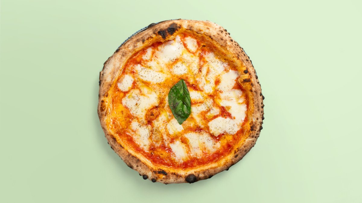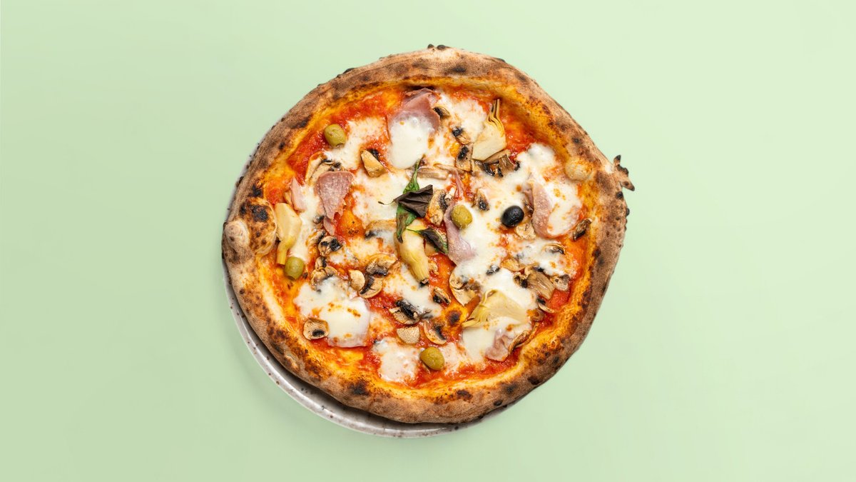 mit Fior di Latte, gekochtem Schinken vom Schwein, Champignons, schwarzen Oliven, Artischocken, Parmesan, Basilikum und Olivenöl