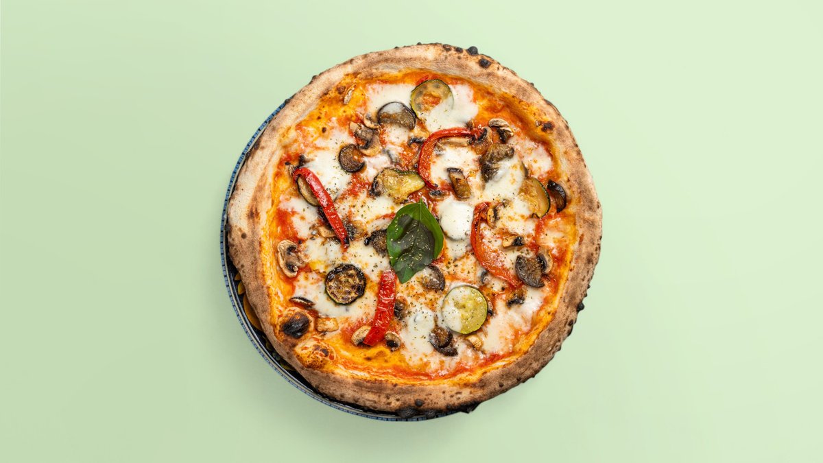 mit Fior di Latte, Parmesan, Basilikum, Knoblauch, Gemüse, Oregano und Olivenöl