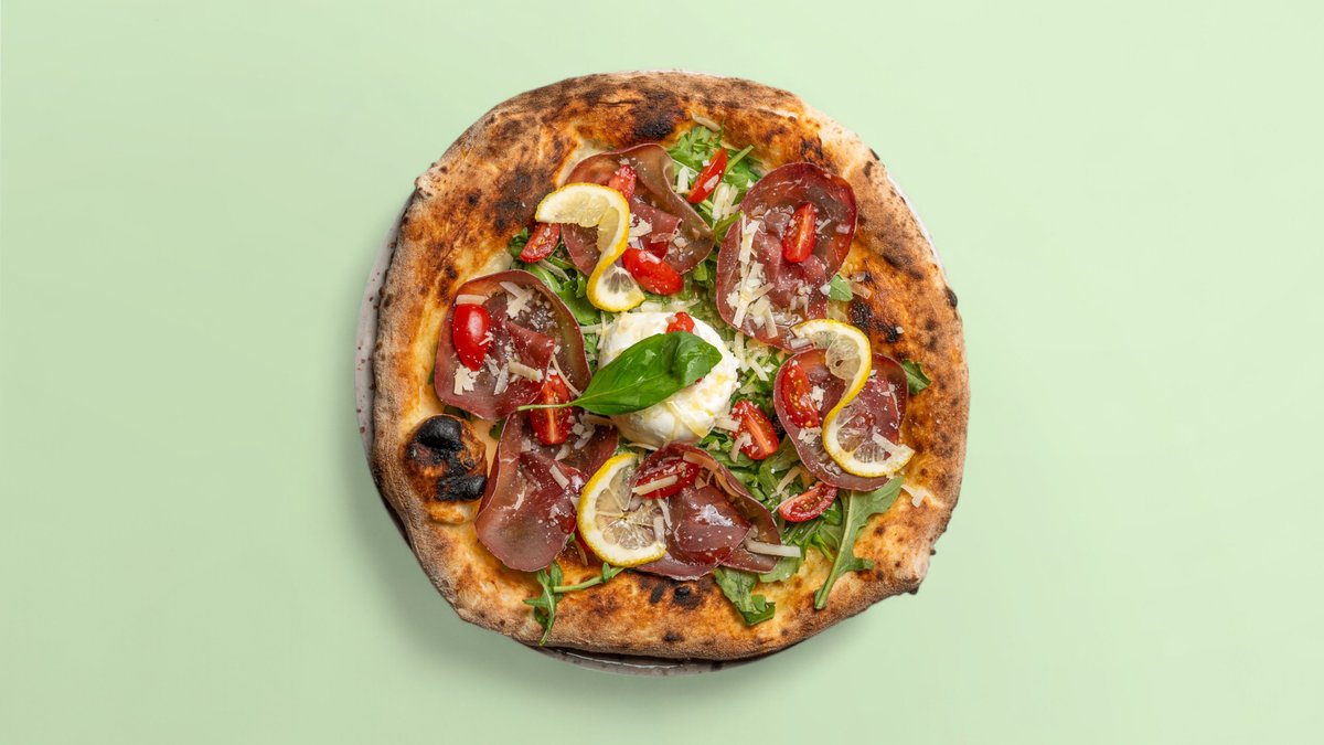 mit Bresaola vom Schwein, Büffelmozzarella, Rucola, Zitronen, frischen Tomaten, Parmesan, Basilikum und Olivenöl