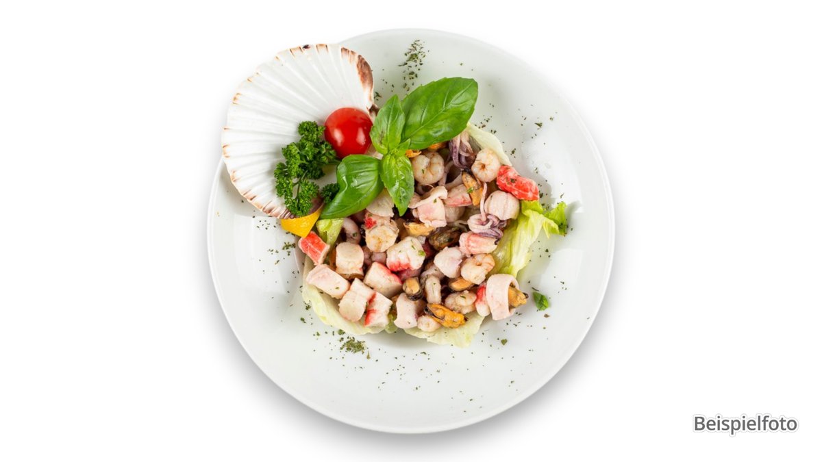 mit Eisbergsalat, Schweineschinken, Ei, Krabben und Käse