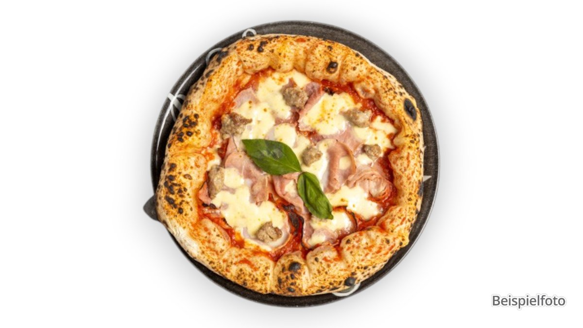 mit gekochtem Schinken, Champignons, Salami und Zwiebeln