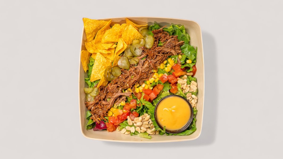 Beef Salat oder Bowl mit Erdnüssen, Gewürzgurken, Tortilla-Crumble und White-Smoked-Sauce