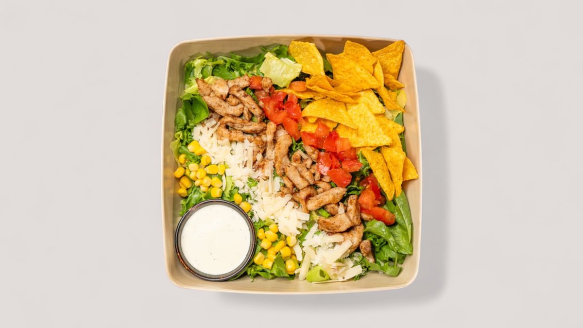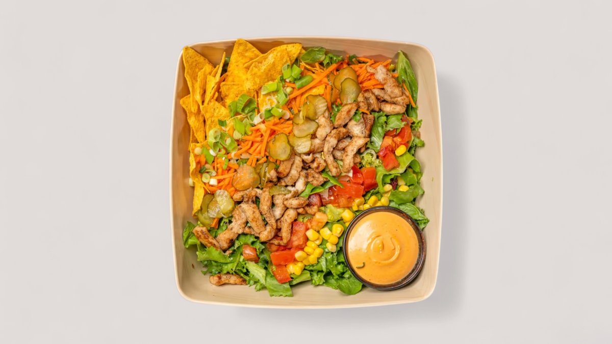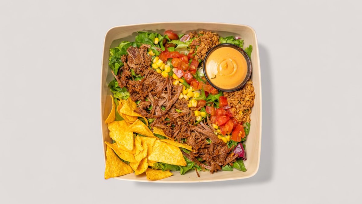 Beef Salat oder Bowl mit Tortilla-Crumble, Röstzwiebeln und Chipotle-Sauce