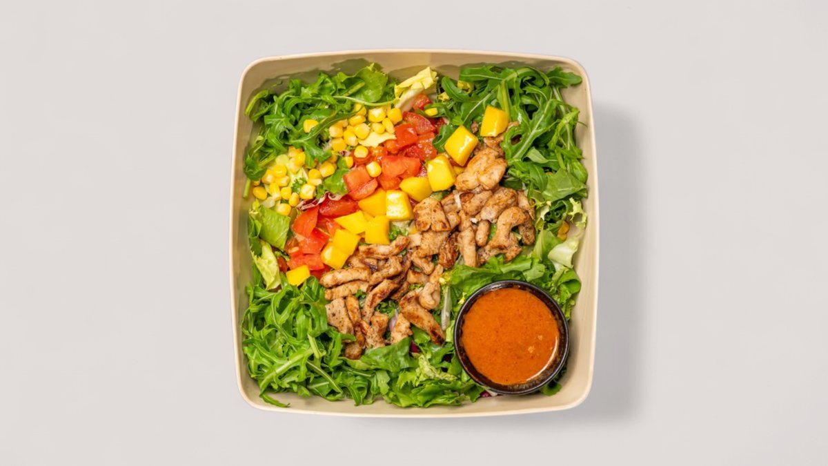 mit Mangostücken, Rucola und Tomate-Chili-Soße