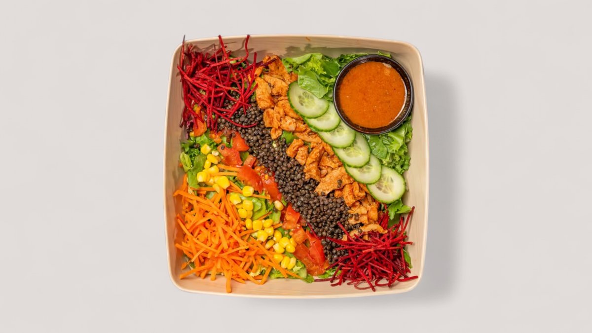 mit Karotten, Gurken, Beluga-Linsen, Rote Beete, Soja-Schnetzel und Tomate-Chili-Sauce