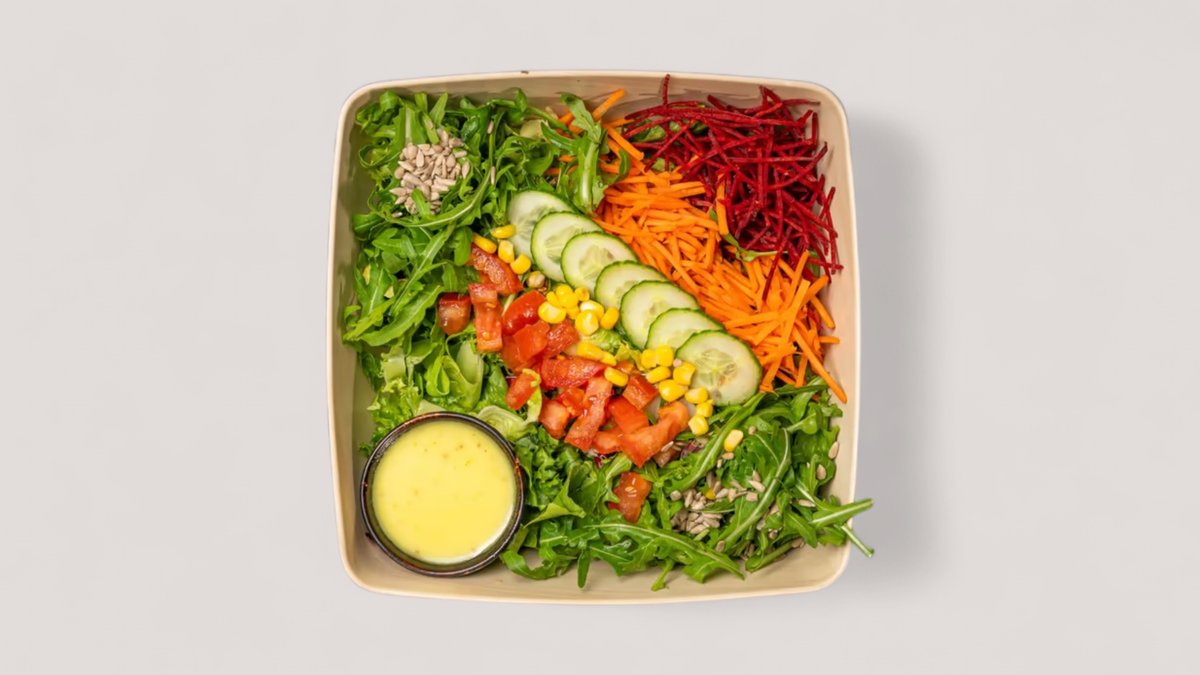 mit Sonnenblumenkernen, Gurken, Rote Beete, Rucola, Karotten und White-Balsamico-Soße