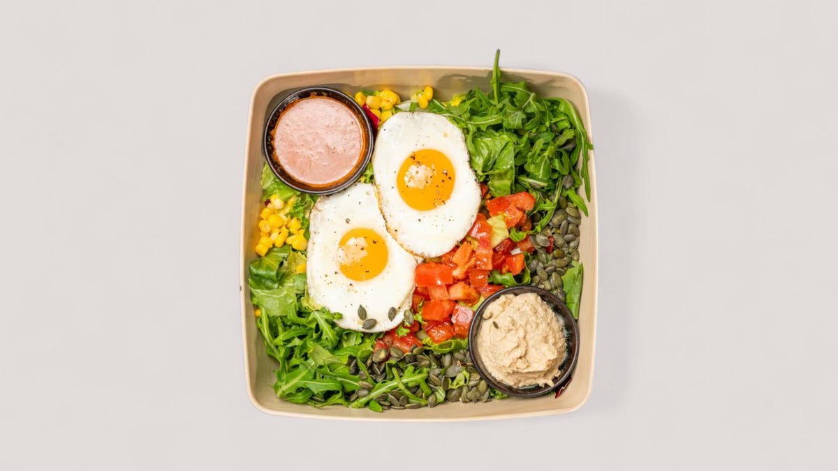 mit Spiegelei, Hummus, Kürbiskernen, Rucola und Tomate-Chili-Soße
