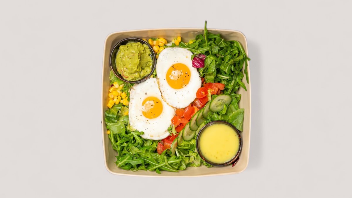 mit Spiegelei, Mashed Avocado, Gurken, Rucola und White-Balsamico-Soße