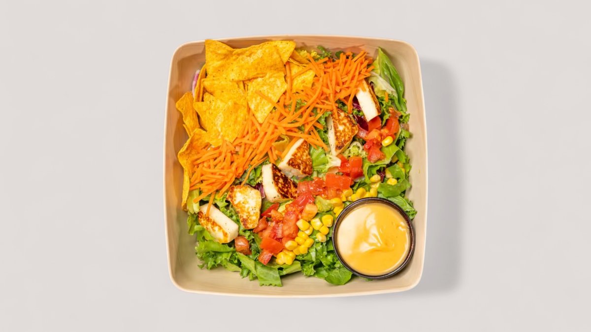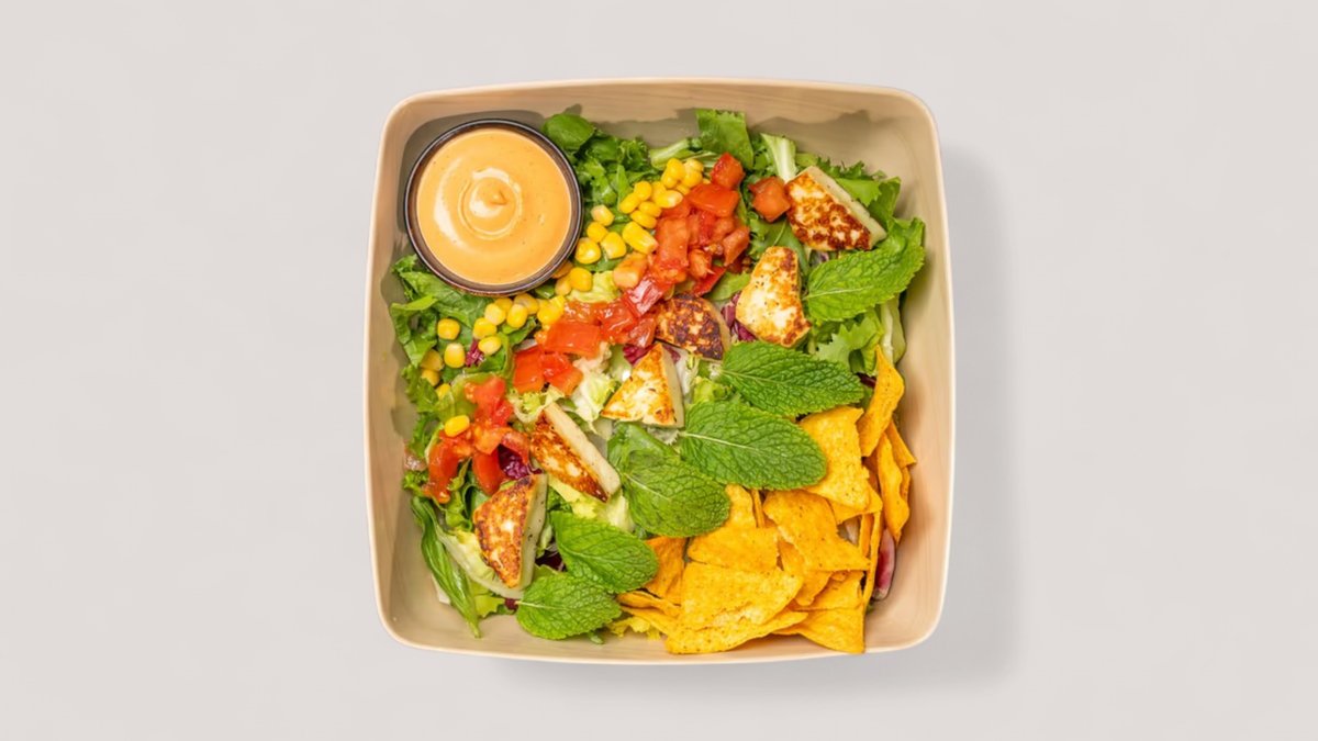 mit Halloumi, Tortilla-Chips, Minze und Chipotle-Soße