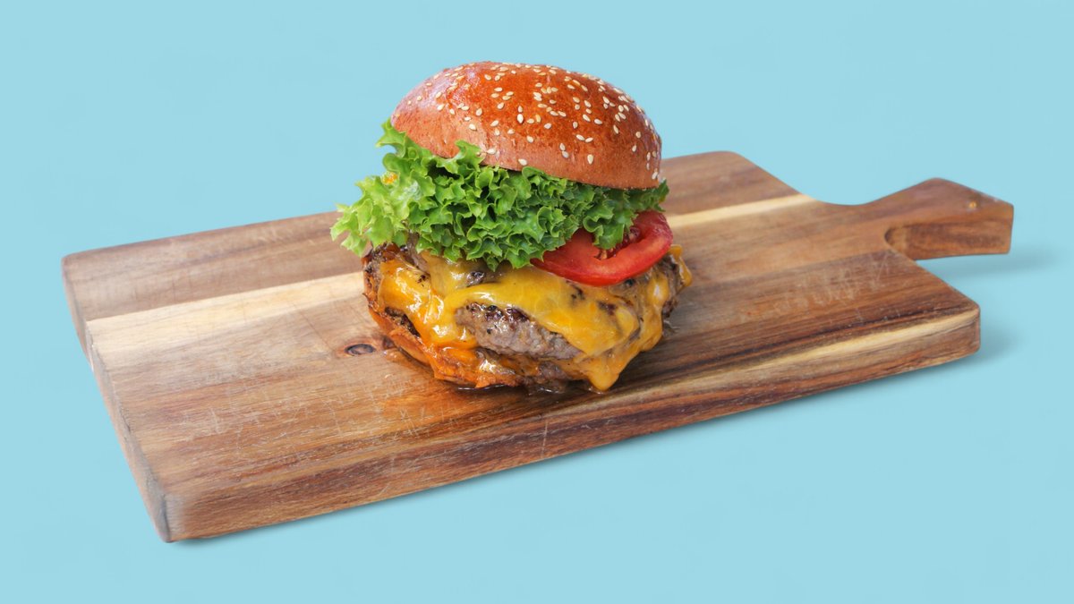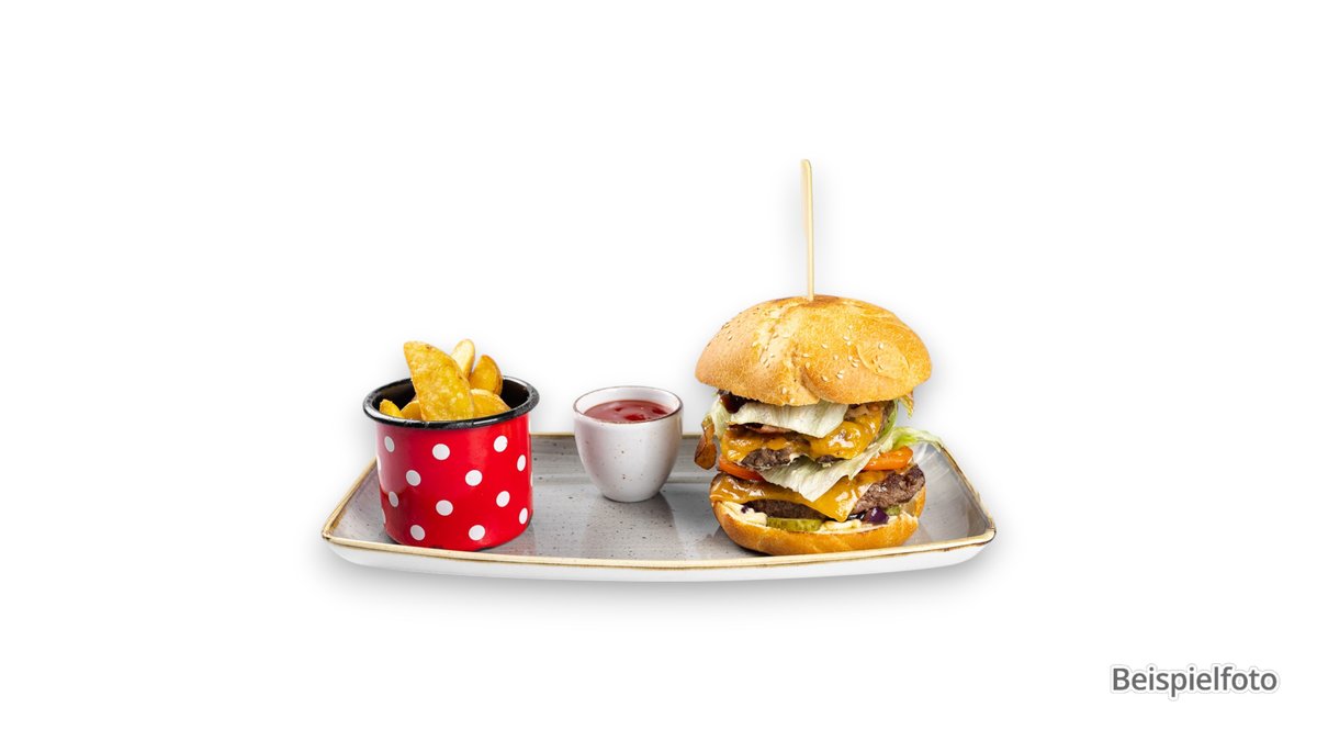 mit 2x Rindfleischpatties, doppeltem Cheddar, Salat, Tomaten, Gewürzgurken, Rocket-Burgersoße