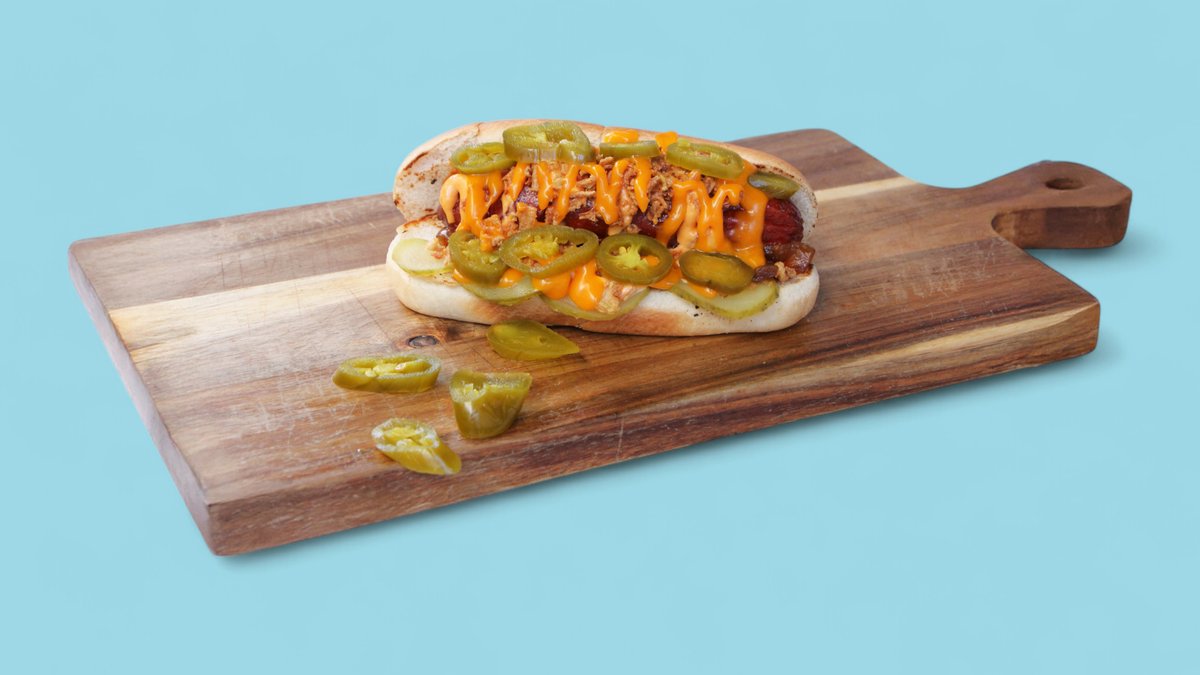 mit geschmolzenem Cheddar, Jalapeños und Fireball-Soße