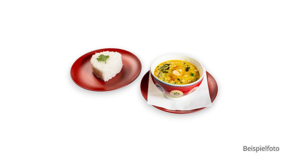 Garnelen mit Blumenkohl, Kartoffeln, frischen Tomaten, Zwiebeln und Knoblauch in Currysoße