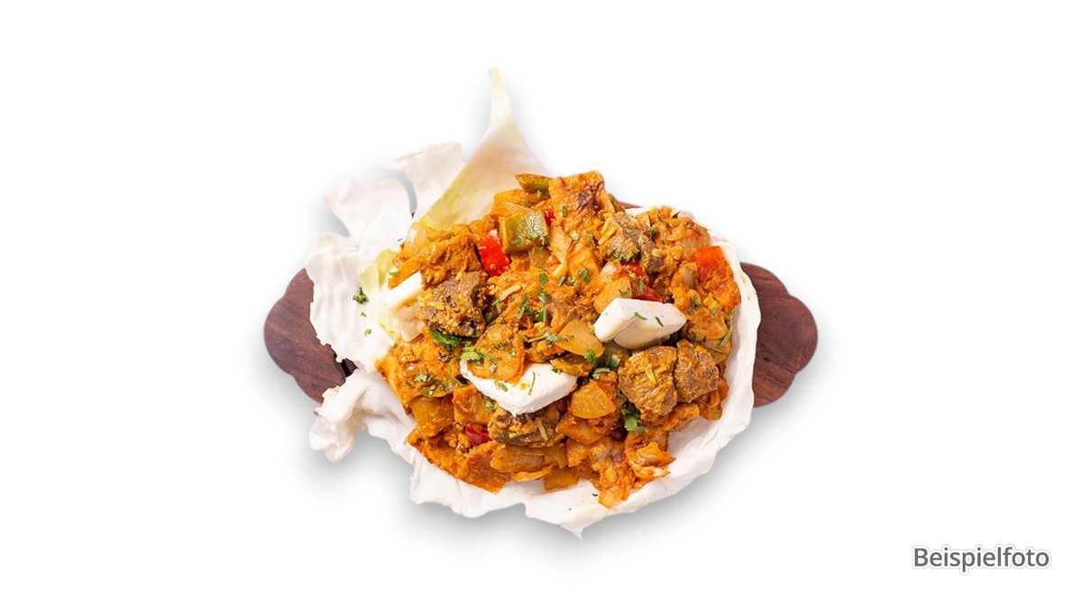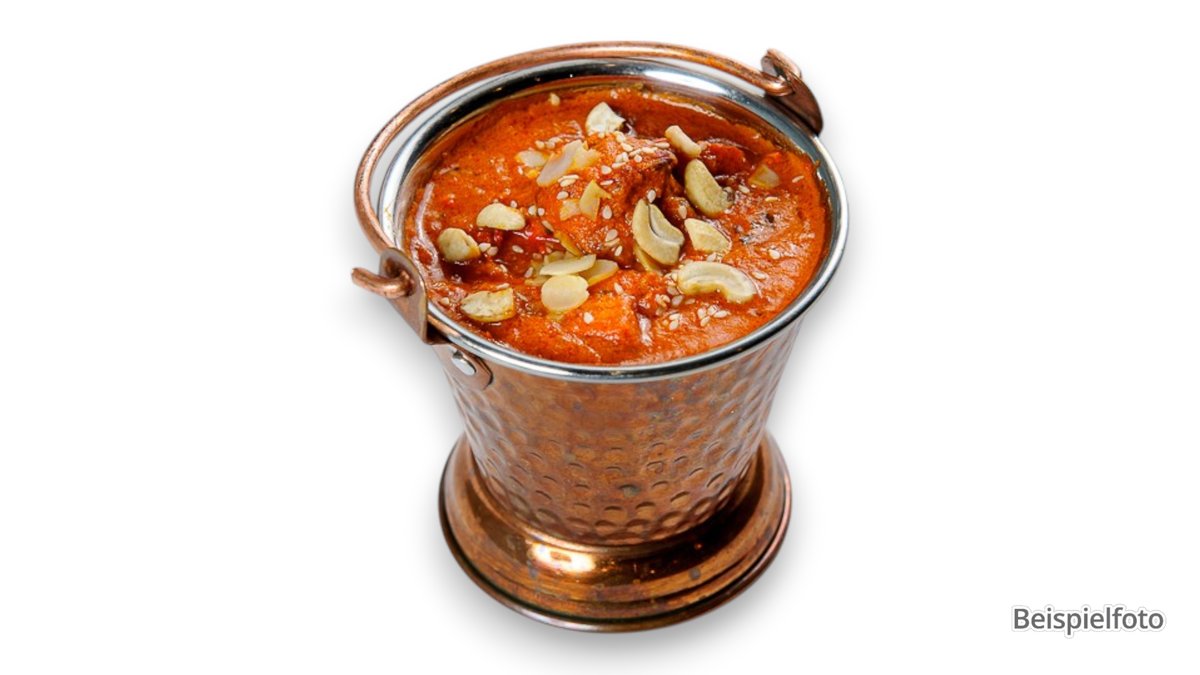 mild zartes Lamm mit Rosinen, Kokosnussen und Cashewnüssen in Kormasoße