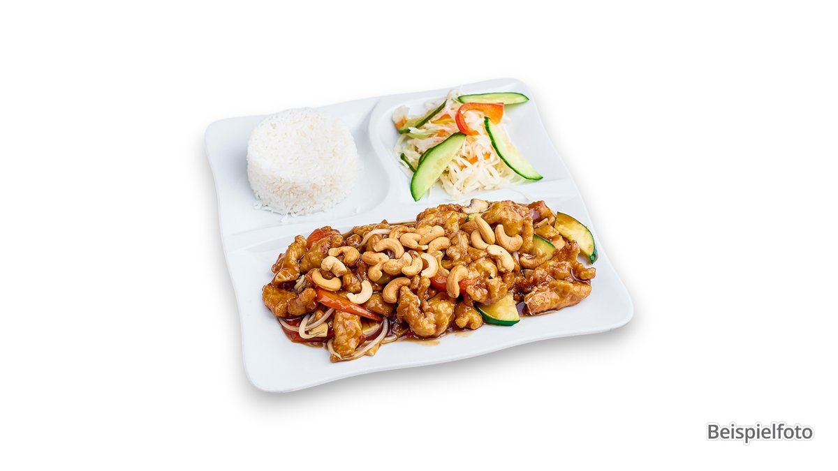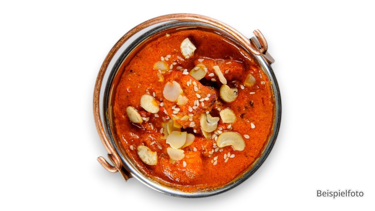 mild zartes Hähnchen mit Rosinen, Kokosnussen und Cashewnüssen in Kormasoße