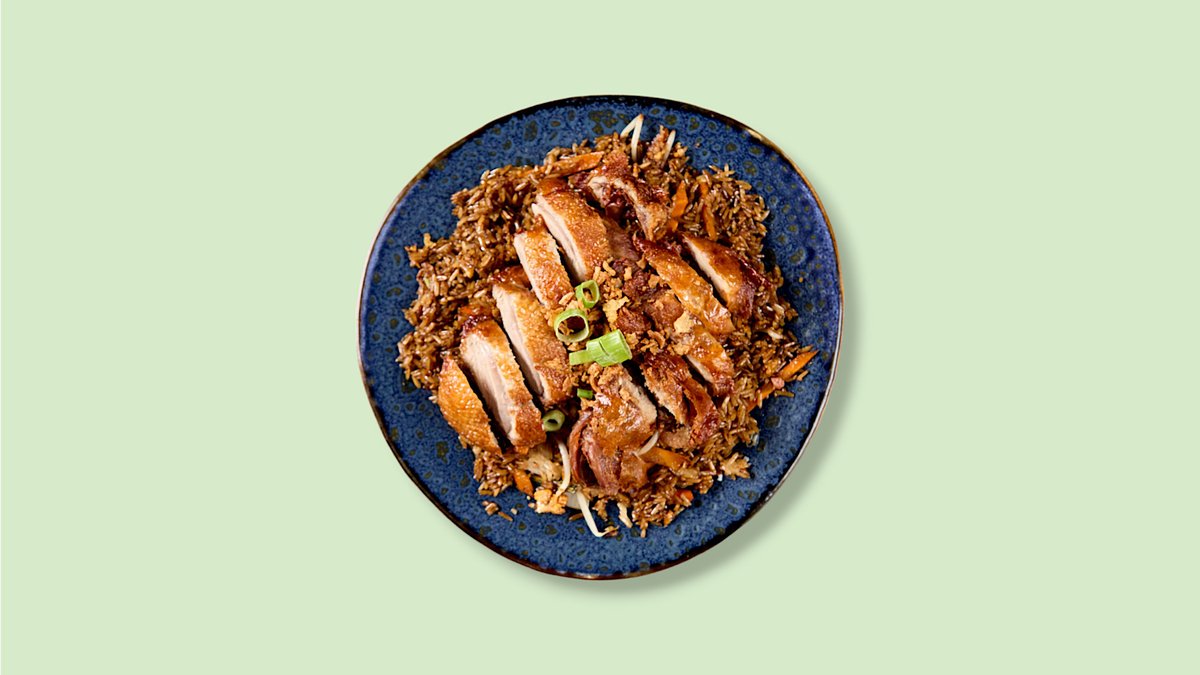 mit Ente, Sojakeime, Karotten, Lauch, Zwiebeln, Ei und Röstzwiebeln