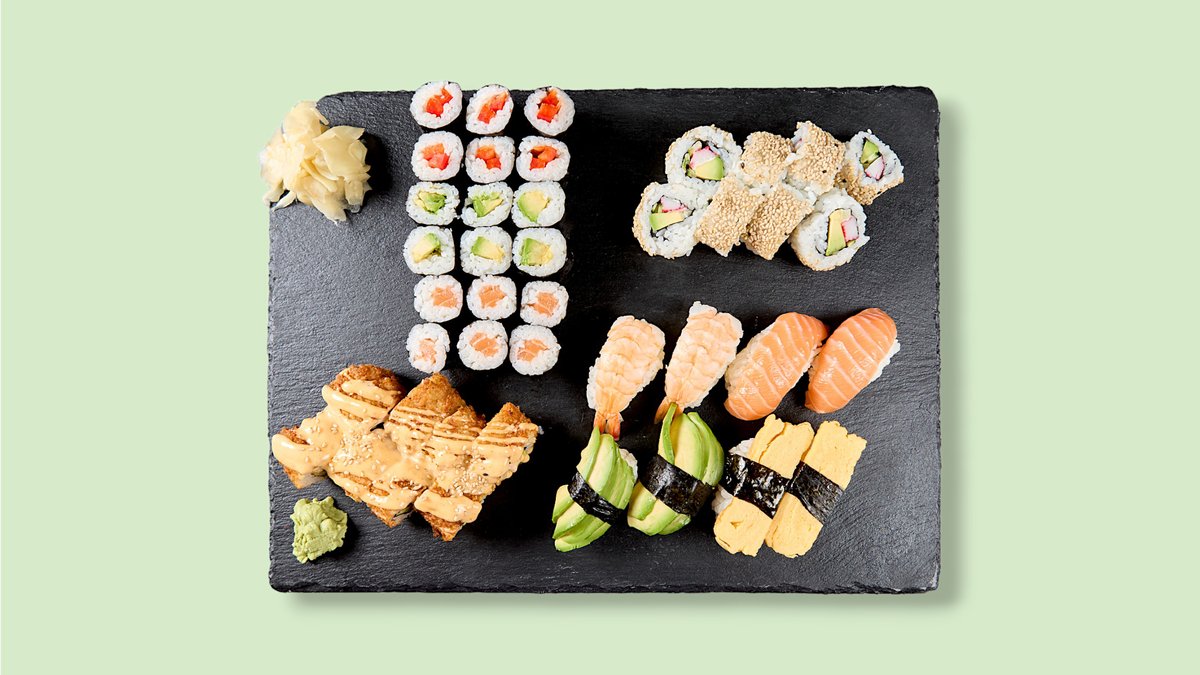 49 Stück 24x Kappa, Paprika, Shinko und Avocado Maki 9x Avocado, Tamago und Inari Nigiri 8x Veggie Inside Out 8x Veggie Crunchy Roll