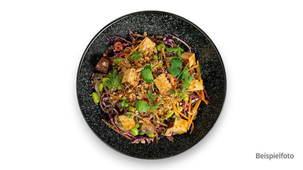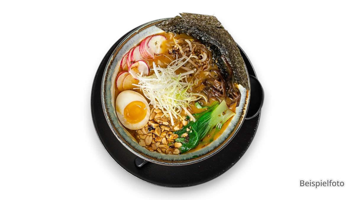 reichhaltige Gemüsebrühe mit Tofu, Shiitake Pilzen, Brokkolini, rotem Ingwer und optionalem Zutat