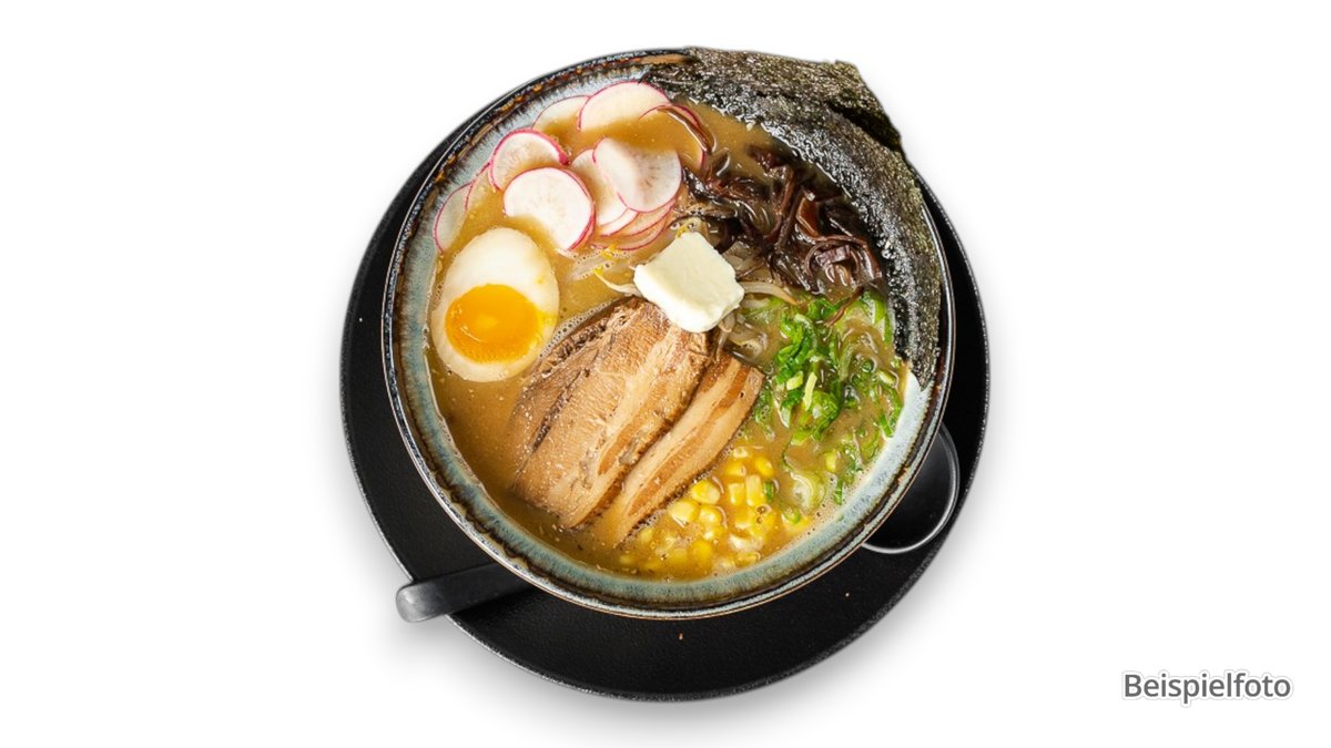 10h gekochte reichhaltige Schweine-Brühe mit Schweinebauch-Chashu, Ei, Kikurage-Pilzen, rotem Ingwer und Narutu-Fischkuchen, ohne Sojasprossen