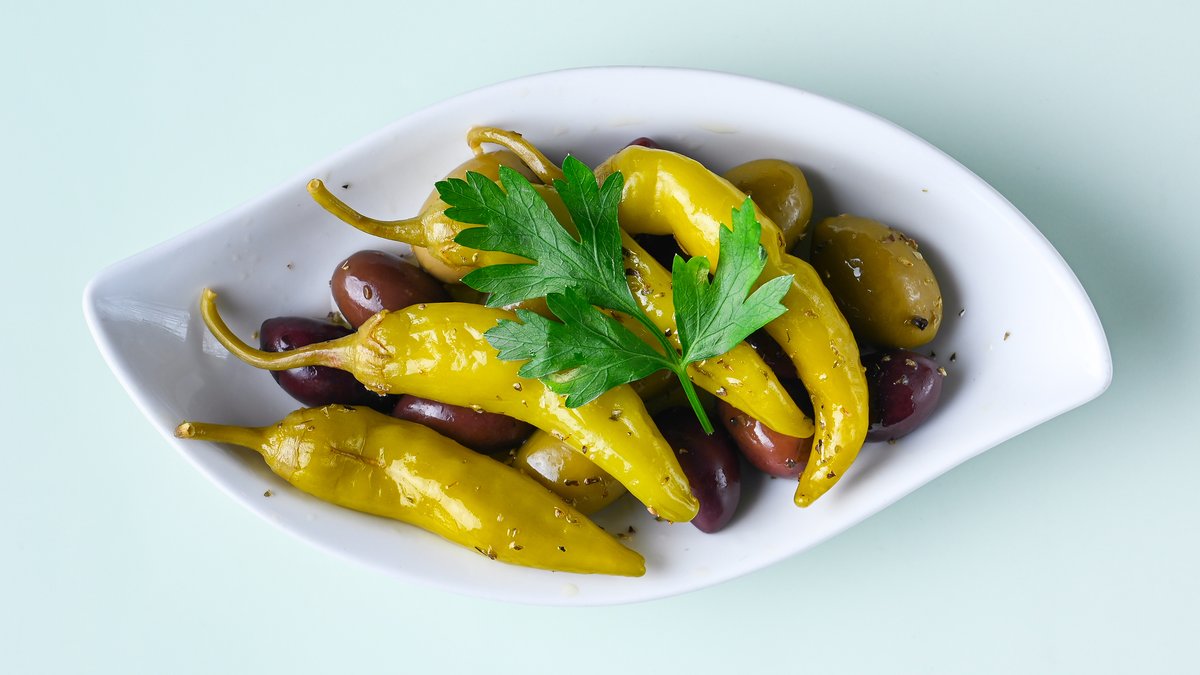 grüne Oliven aus Chalkidiki und schwarze Oliven aus Kalamata mit Dimitra Peperoni
