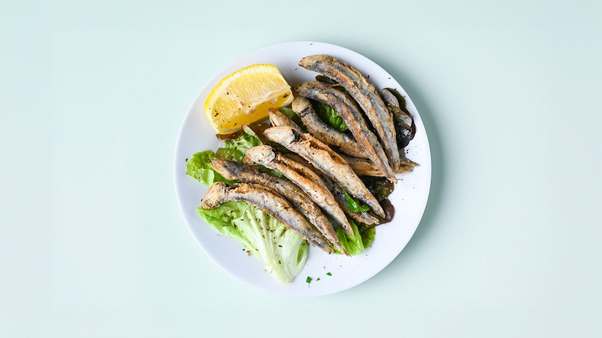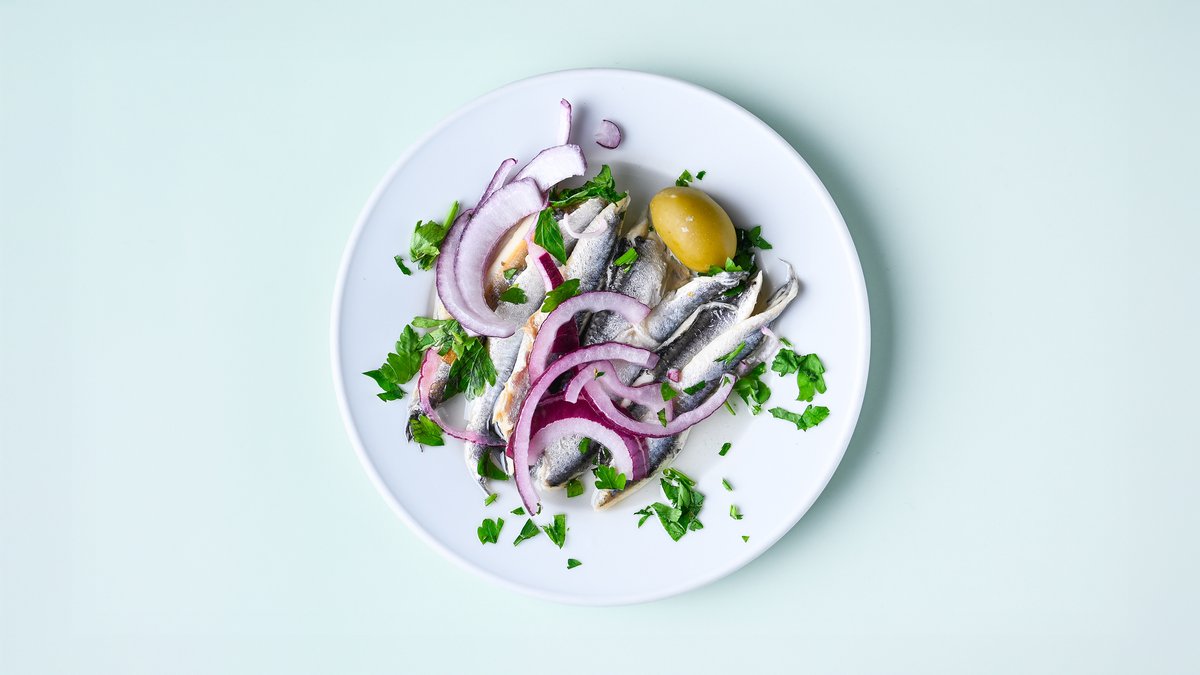 kalt marinierte Sardellenfilets mit Oliven und roten Zwiebeln