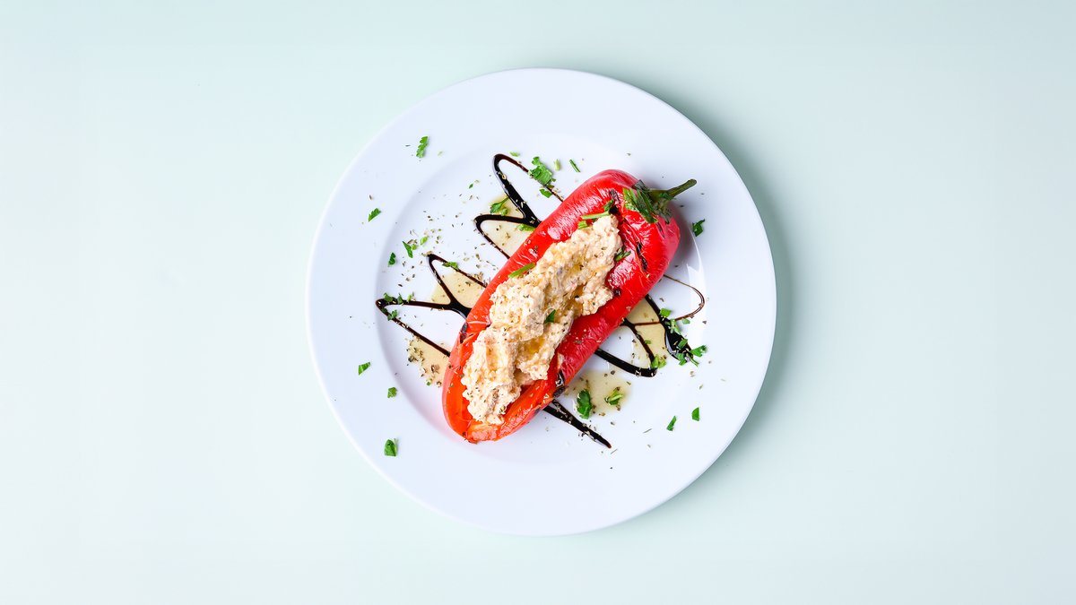 gemistes gegrillte, rote Paprika gefüllt mit Schafskäsemousse