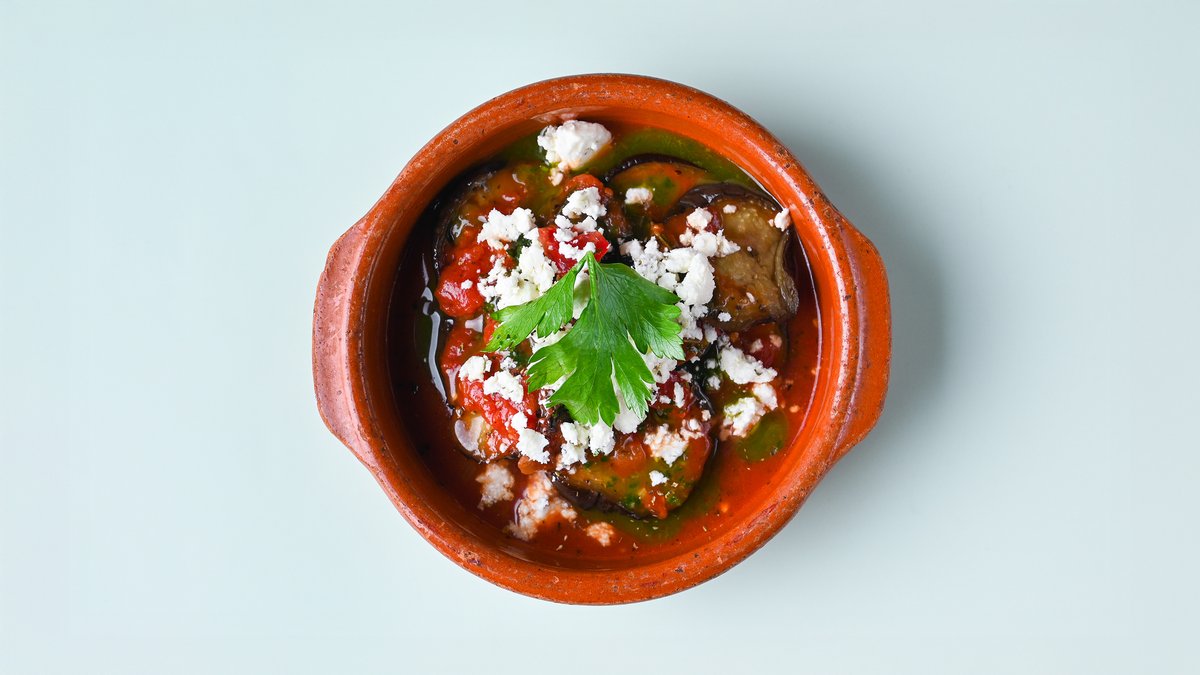 gegrillte Auberginenscheiben mit Tomatensoße, Basilikum-Pesto und Feta