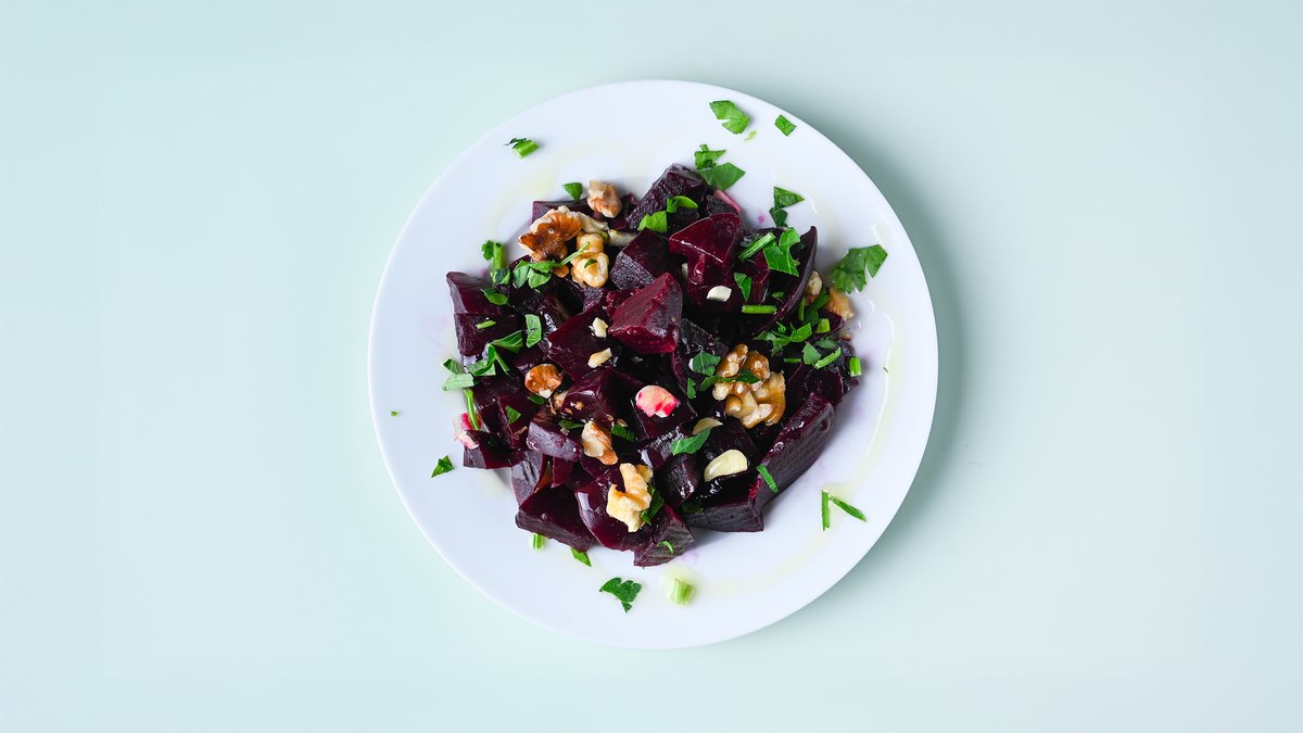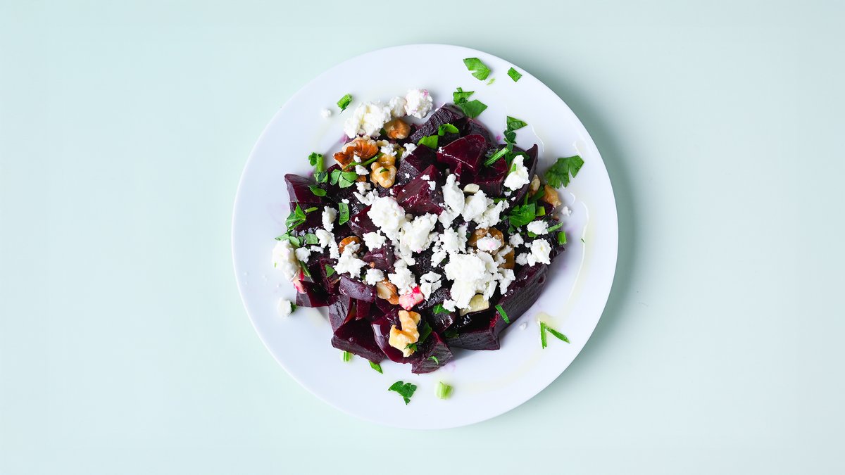 Wildkräutersalat mit salzlosem Ziegenkäse, Walnüssen und getrockneten Feigen