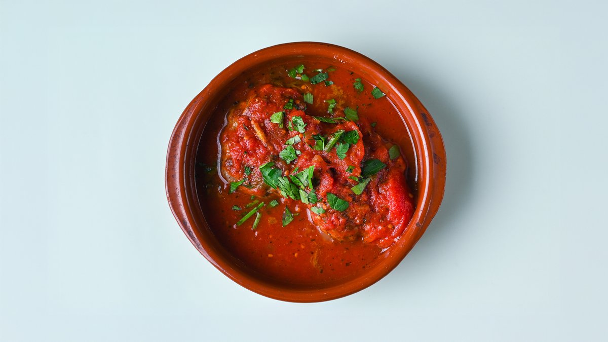 geschmortes Lamm aus dem Ofen und Tomatensoße auf Reisnudeln