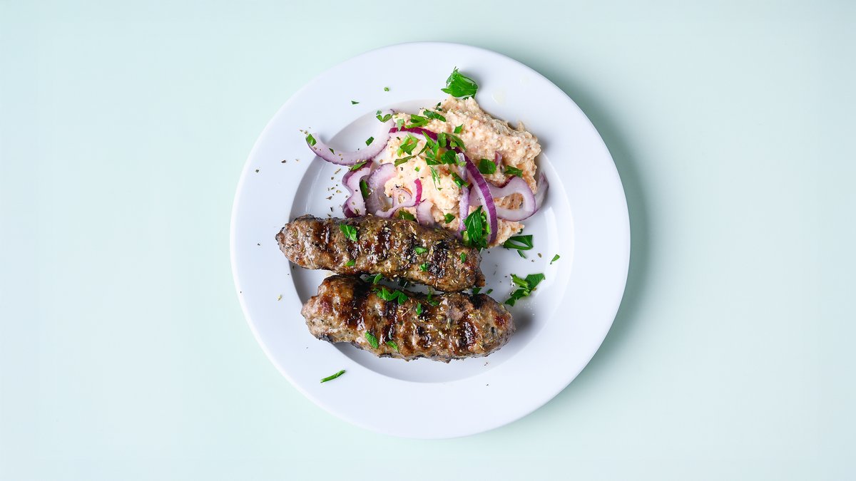 gegrillte Schweinefiletspieße mit Auberginenmousse