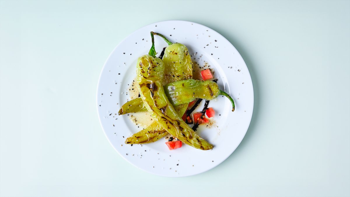 gebratene, milde, grüne Paprika in Olivenöl-Balsamico Marinade