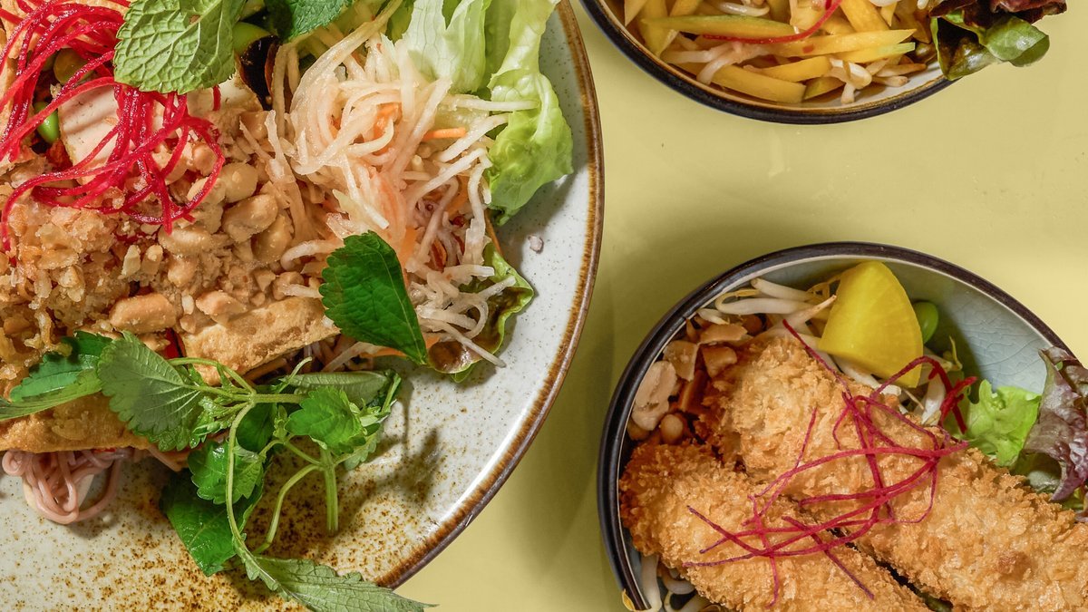 braune Reisnudeln mit frischem Salat-Mix, Sojasproßen, Gurken, Kräutern, Karotten, Erdnüssen, Röstzwiebeln, Limetten-Dressing und einer Zutat deiner Wahl