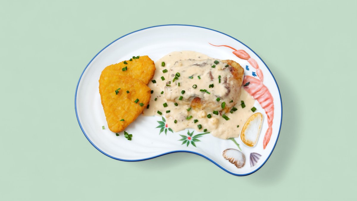 mit Sauce hollandaise, Pilzen, Röstzwiebeln und Käse überbacken