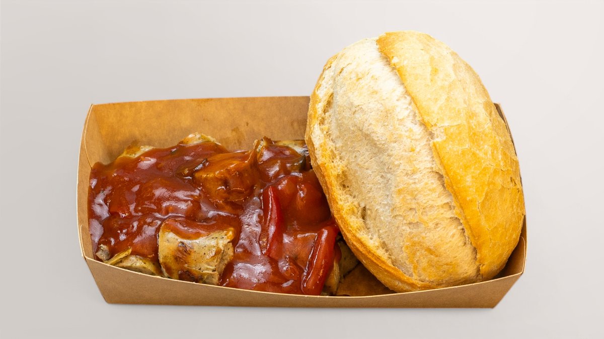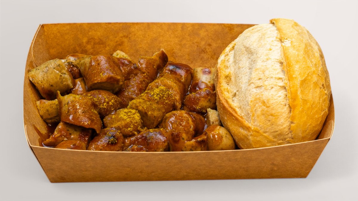1x Currywurst aus Schwein 1x Portion Pommes frites 1x vegane Mayonnaise