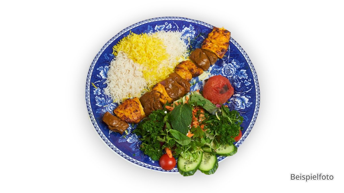 4x Hackfleischspieß vom Lamm 2x in Safran marinierter Hähnchenspieß 1x Gheymeh Bademjan 1x Ghorme Sabzi ohne Grilltomaten